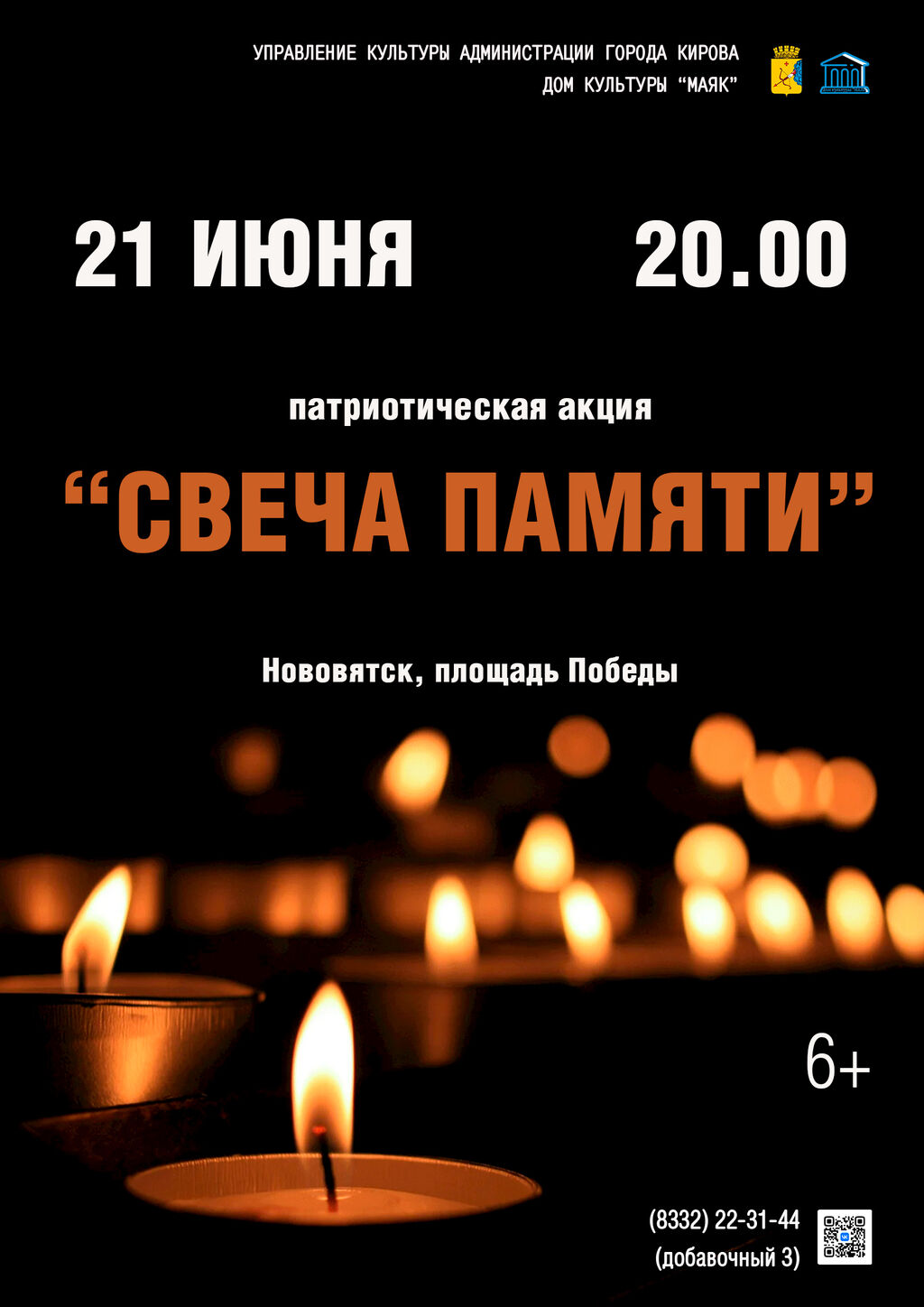 22 июня – День памяти и скорби. В этот день 84 года назад жизнь почти 200 млн. человек разделилась на «до и после» – началась Великая Отечественная война. Ежегодно в преддверии Дня памяти и скорби в ночной тишине по всей стране загораются свечи, которые символизируют память обо всех, кто отдал жизнь во имя Великой Победы, об уходящих все дальше и дальше военных годах. В канун трагической даты в Нововятском районе на площади Победы (гж. Киров, ул. Ленина, 14) пройдет акция «Свеча памяти». Все желающие смогут присоединиться к акции: принести свою свечу, лампадку и зажечь ее в память о героях, о родных и близких, переживших самую кровопролитную войну ХХ века.