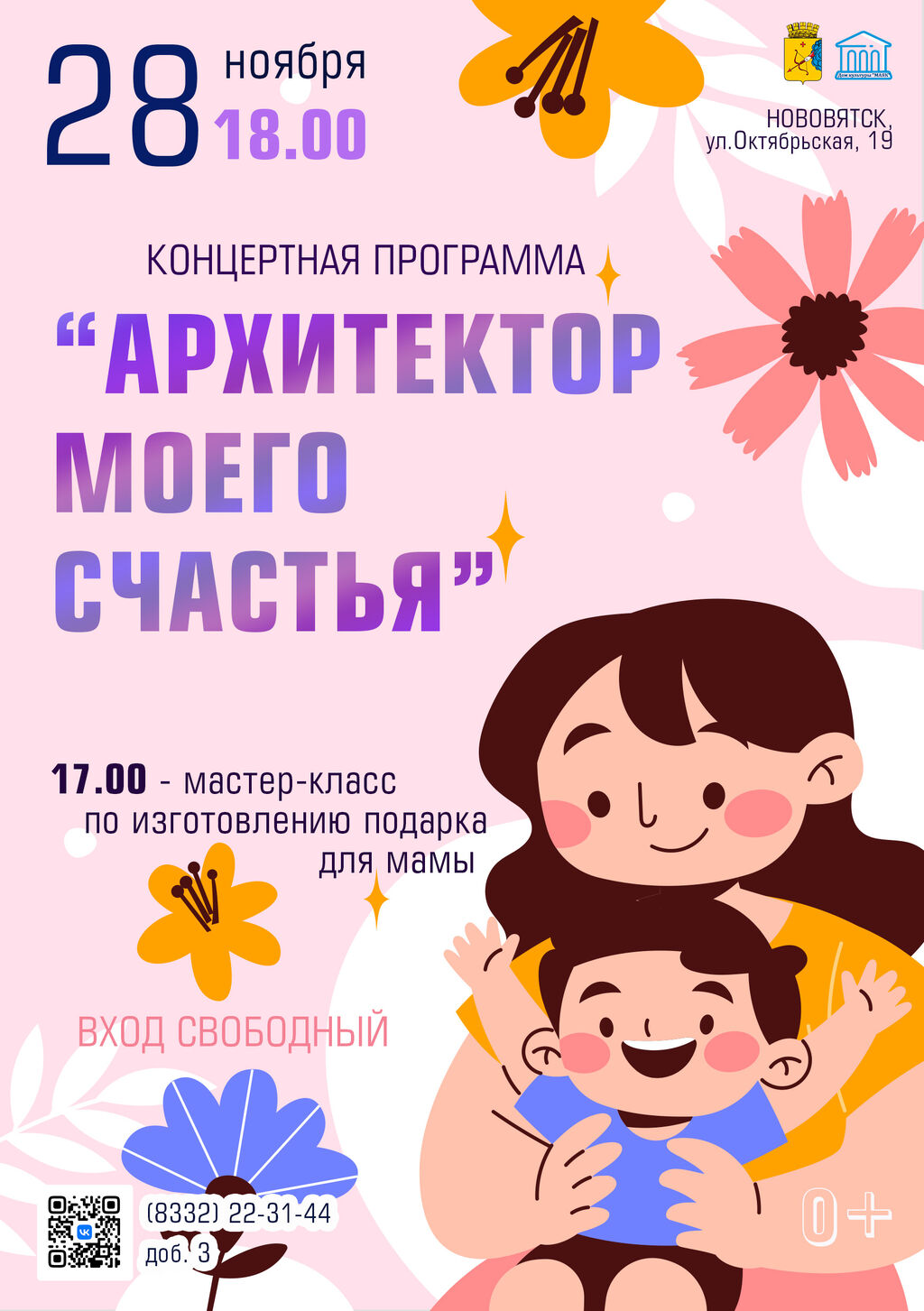 28 ноября в 18.00 ч. в доме культуры «Маяк» (г. Киров, Нововятский район, ул. Октябрьская, 19) пройдет концертная программа «Архитектор моего счастья», посвященная Дню матери.
